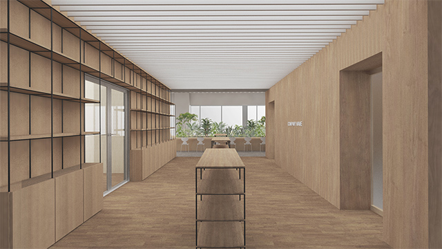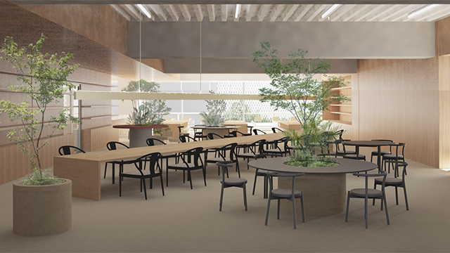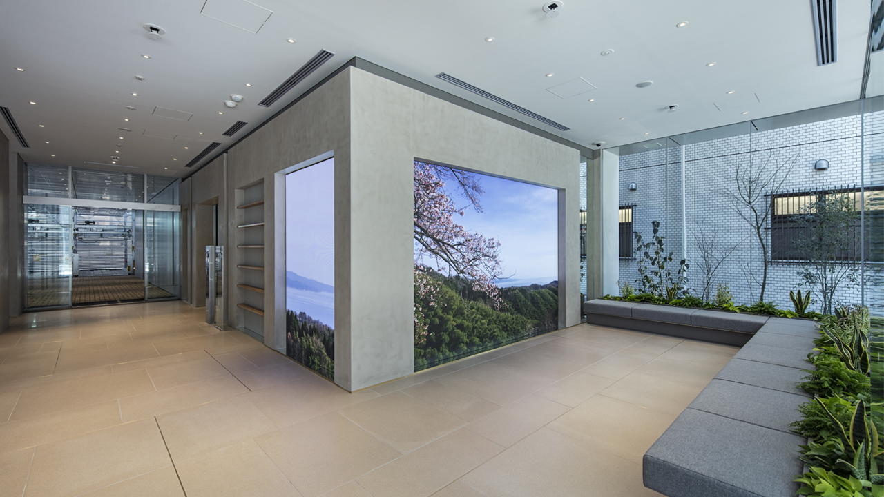 - 内装デザインは、木・石・土・植物などの自然の素材を使い、温かみと上質さを感じられる印象に。エントランスホールには、四季折々の景色や日本のものづくりの風景を映す大画面デジタルスクリーンを設置。はたらく人に癒しを与え、創造性や好奇心を誘発します。