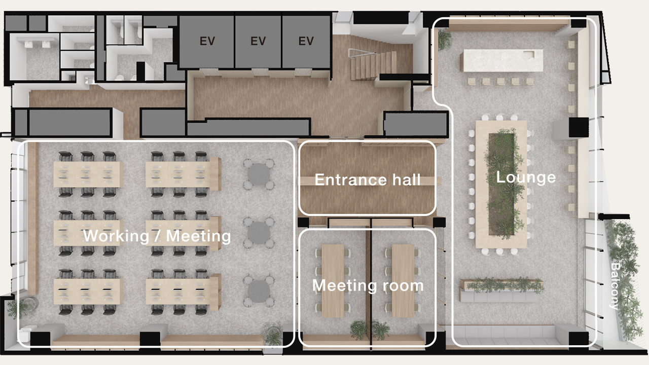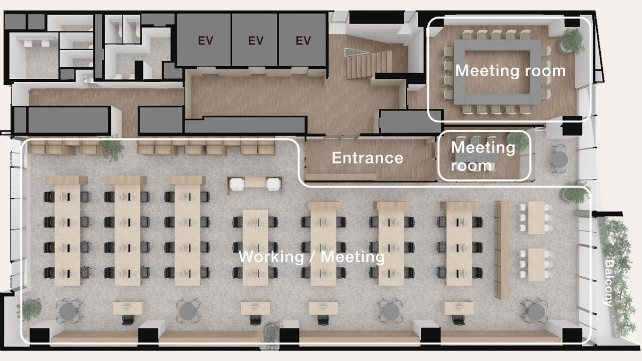 Plan 2アイランド型プラン52席分を確保し、社員数の増加にも対応しやすい執務ゾーンに加え、大人数での会議や、来客対応など、シーンによって使い分け可能な大小の会議室もございます。 - 52席