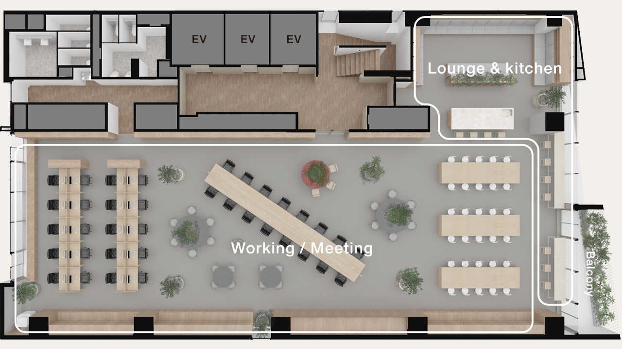 Plan 3オープンプラン光や風を感じる開放的な空間が、コミュニケーションを促進。家具で窓るを作るため、レイアウト変更もフレキシブルに行えます。 - 36席