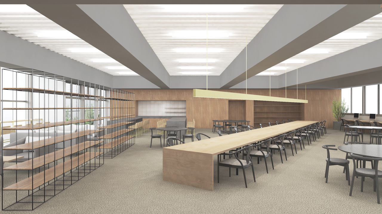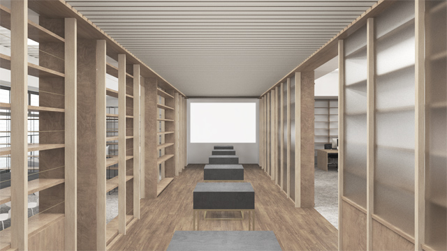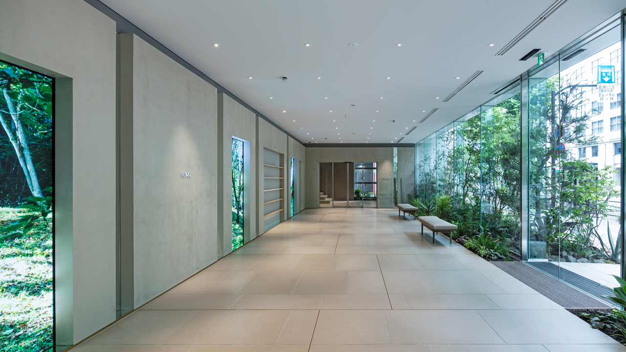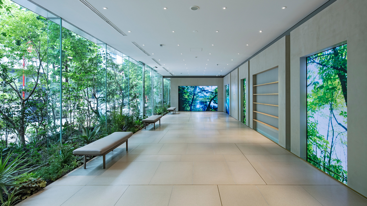 - 内装デザインは、木・石・土・植物などの自然の素材を使い、温かみと上質さを感じられる印象に。エントランスホールには、四季折々の景色や日本のものづくりの風景を映す大画面デジタルスクリーンを設置。はたらく人に癒しを与え、創造性や好奇心を誘発します。