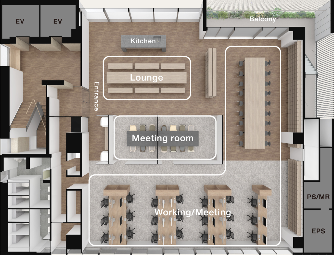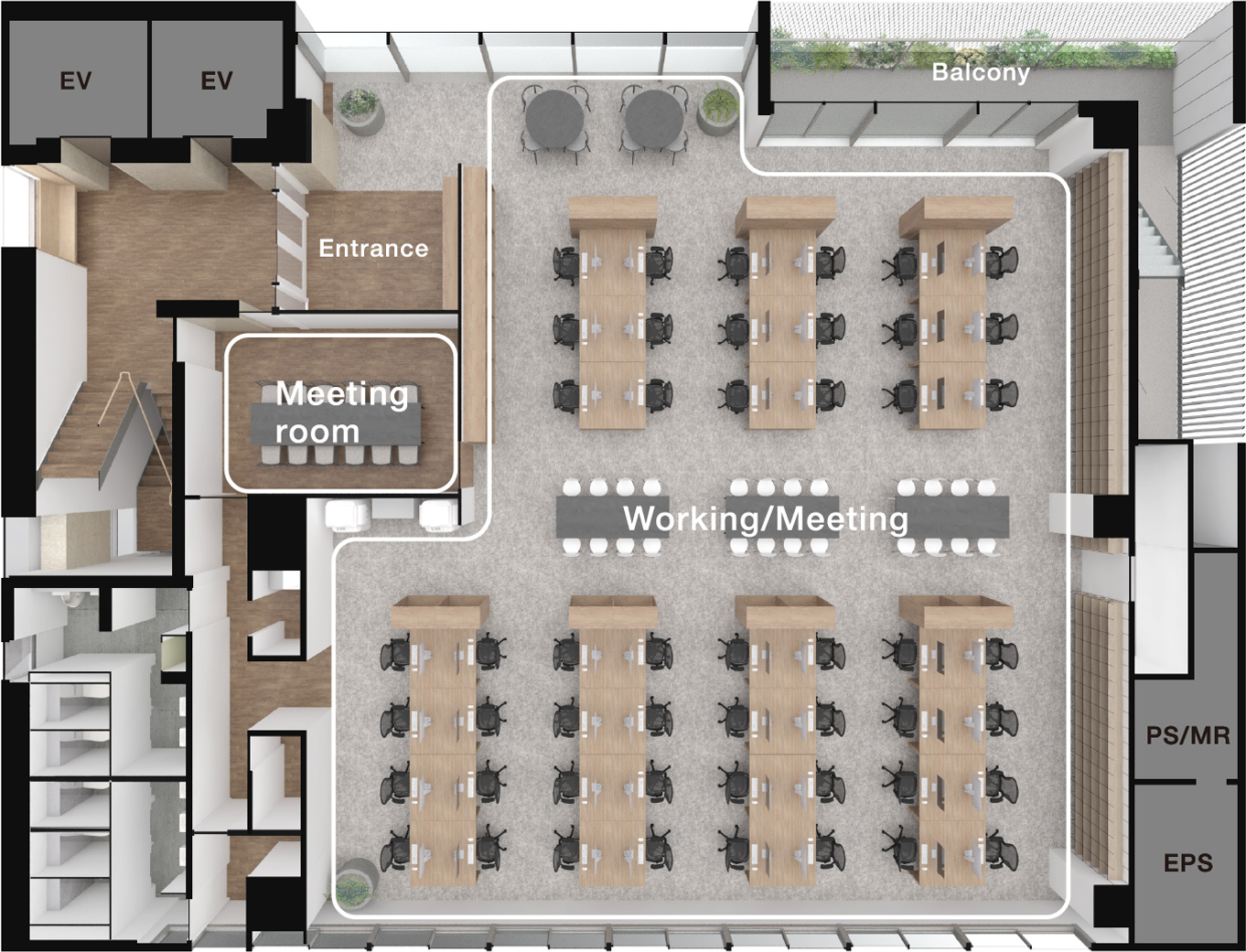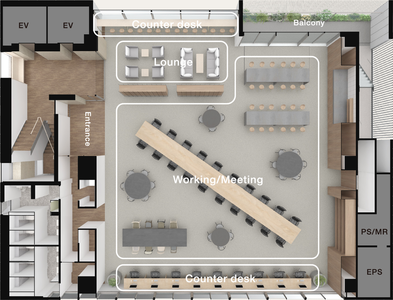 固定デスクとフリーアドレスを併設し、業務に応じて使い分けられます。ミーティングスペースを中央に配置した集いやすい空間です。