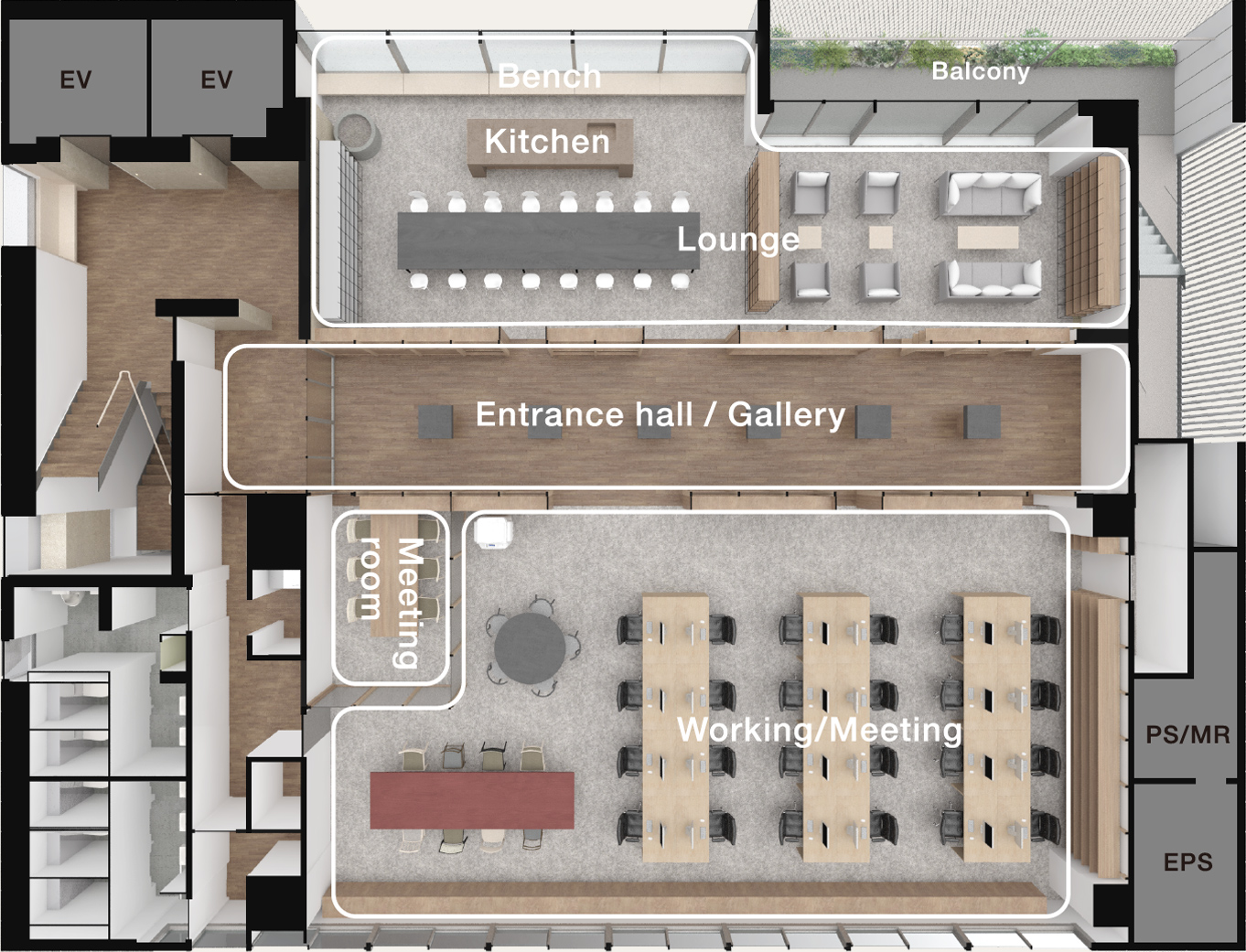 - 各階にテナント専用のバルコニーを設置。オープンで心地良いリフレッシュ空間を提供します。