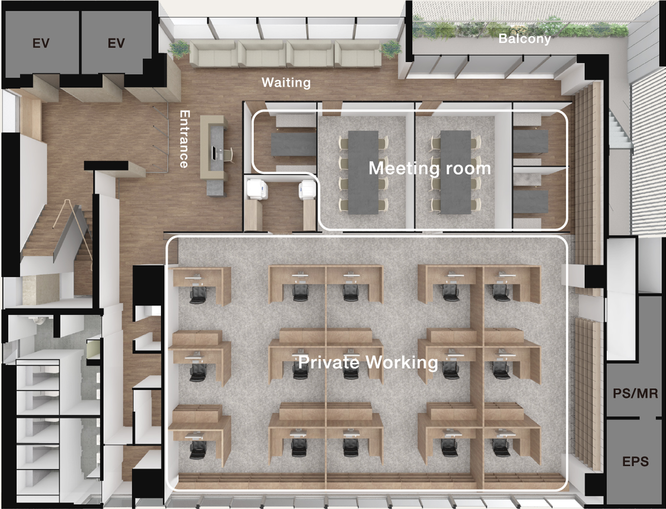 機密事項を取り扱う士業などのスペシャリスト業務に対応。プライベート性の高い執務ゾーンや、独立型の会議室を設置しています。